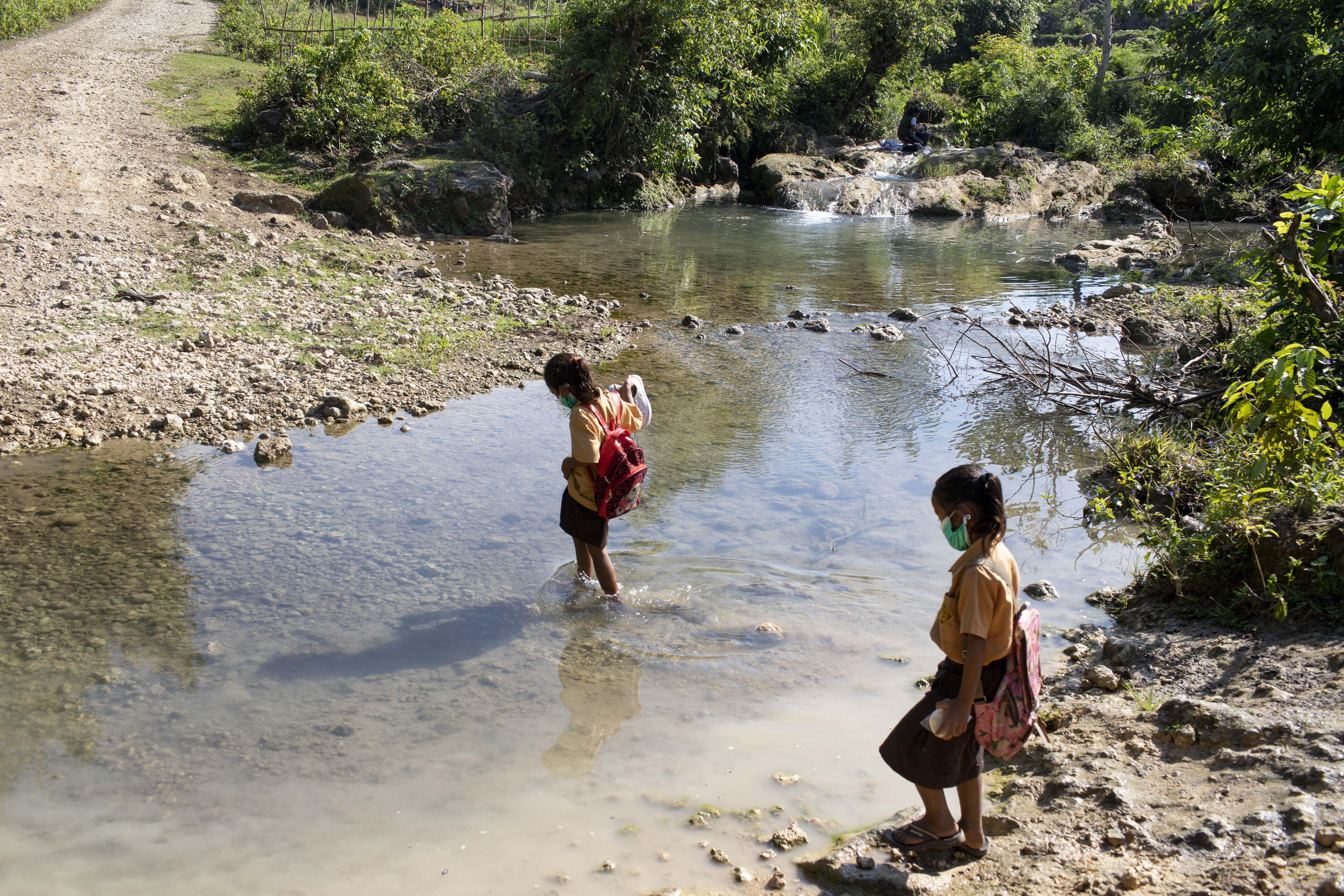 Mereka harus melepas sepatu agar tidak basah saat menyeberang sungai. Di musim hujan sungai ini sering banjir sehingga Ina dan murid lain tidak bisa berangkat ke sekolah.