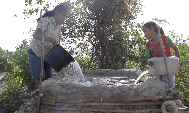 Ina membantu ibunya membersihkan tanah garam untuk diolah menjadi garam.